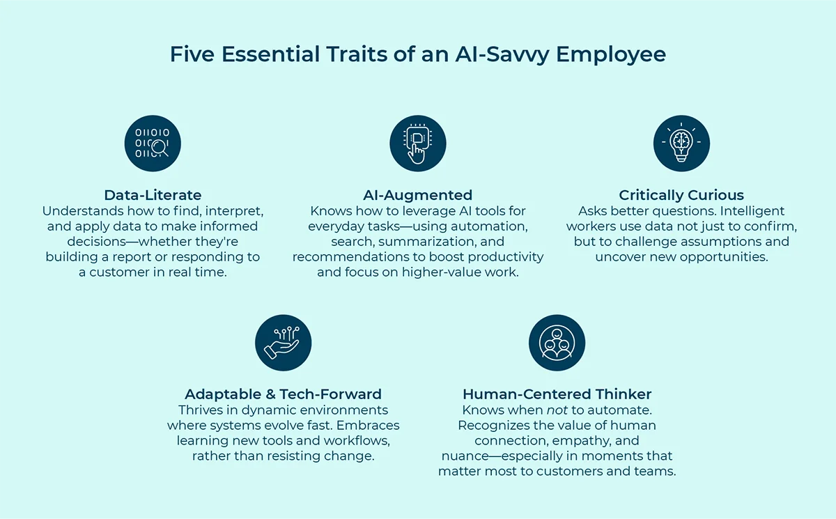 AI is changing the talent landscape. To turn a business into an intelligent enterprise, leaders must create an intelligent workforce by preparing existing and future employees for the impact that AI will make on daily and unexpected tasks. Take note of talent who prioritize creativity, problem-solving, and data literacy. Most importantly, look for workers who take on a human-centered approach by using real-world context to critically evaluate AI-generated outputs.