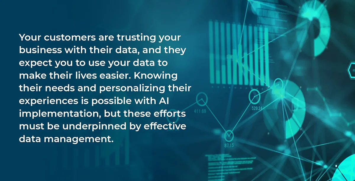 The quality of your data infrastructure can also affect the customer experience. After all, your customers are trusting your business with their data, and they expect you to use your data to make their lives easier. Knowing their needs and personalizing their experiences is possible with AI implementation, but these efforts must be underpinned by effective data management.